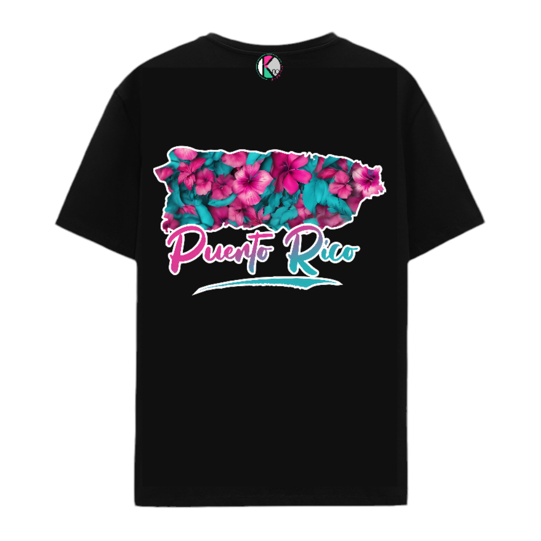 Esta camiseta presenta un diseño colorido con flores vibrantes que forman la silueta de la isla de Puerto Rico, acompañadas de un elegante texto que dice "Puerto Rico". Es perfecta para quienes desean llevar consigo la belleza natural y el espíritu vibrante de la isla.