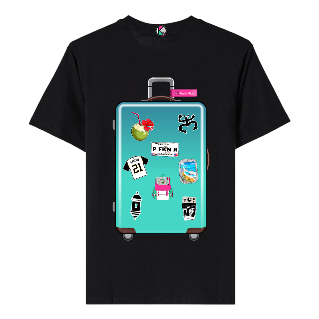 Esta camiseta presenta una divertida maleta decorada con pegatinas de colores que representan la cultura puertorriqueña e íconos como el coquí, el coco y la camiseta de Clemente. Es perfecta para quienes aman viajar con orgullo boricua en el corazón, llevando un pedacito de la isla a donde quiera que vayan.